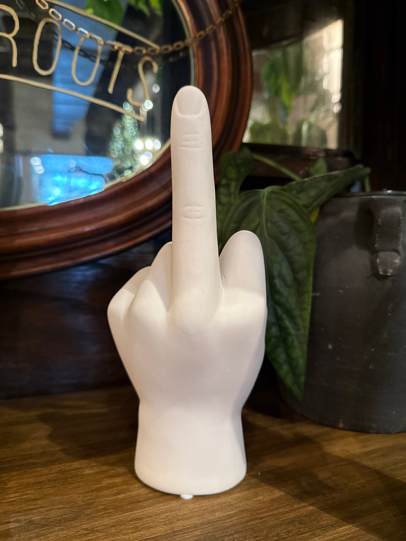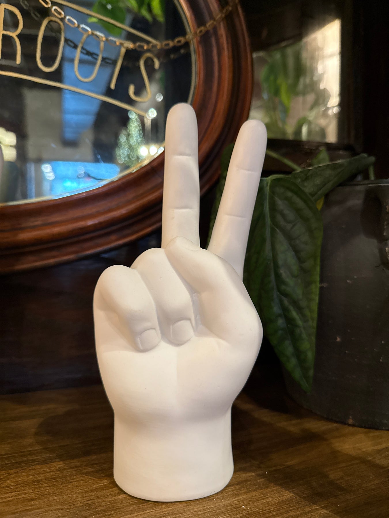 Handmade porcelain hand sculptures in middle finger or peace signs. Perfect for your shelfie.