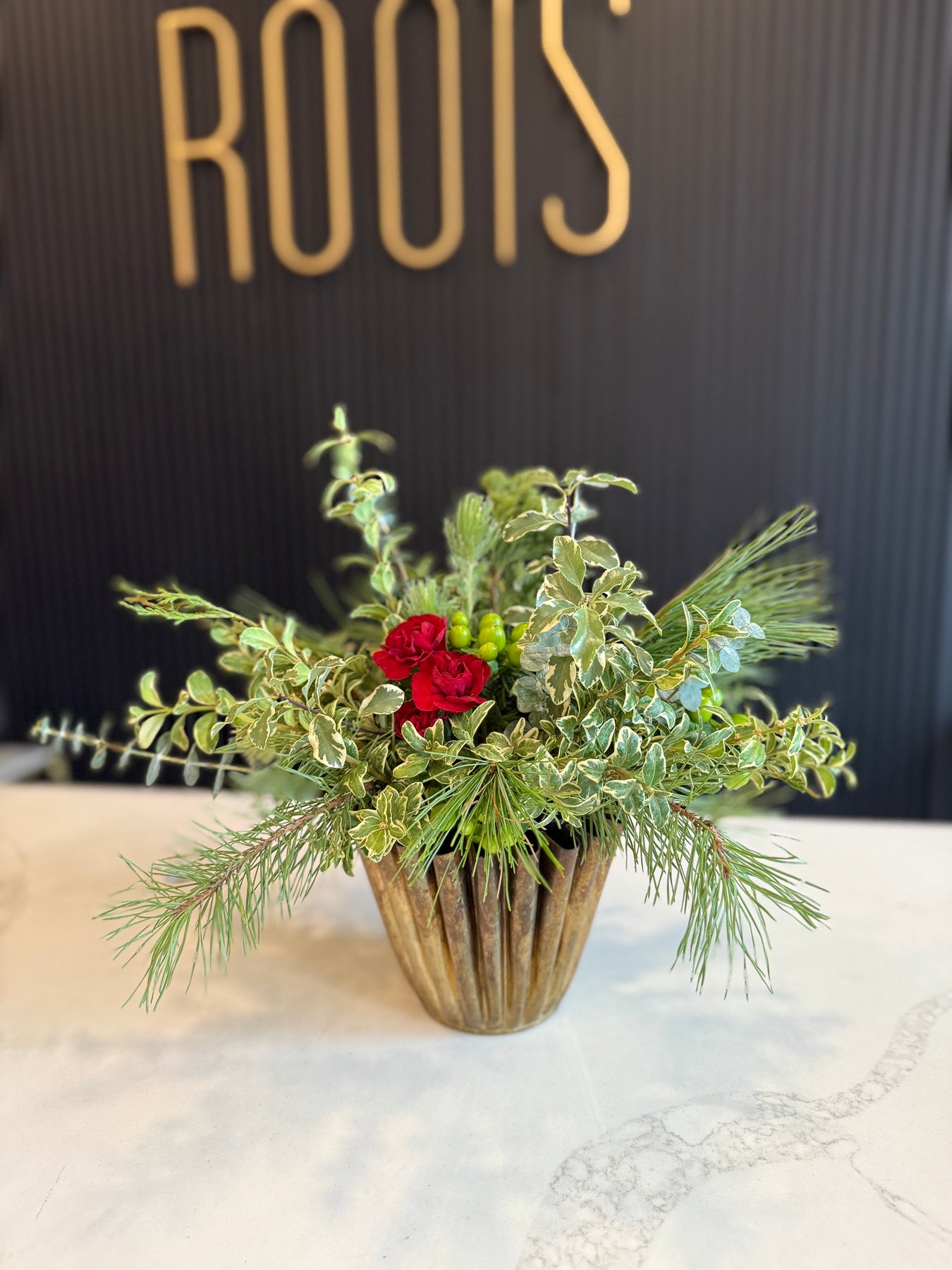 Handmade locally in Glen Ellyn by the wonderful men at the Esotarium! These fresh arrangements create a distinctive holiday centerpiece. Each comes with a 4” burnished brass planter that can be filled with a plant after the holidays. An absolutely perfect gift for the host or hostess!