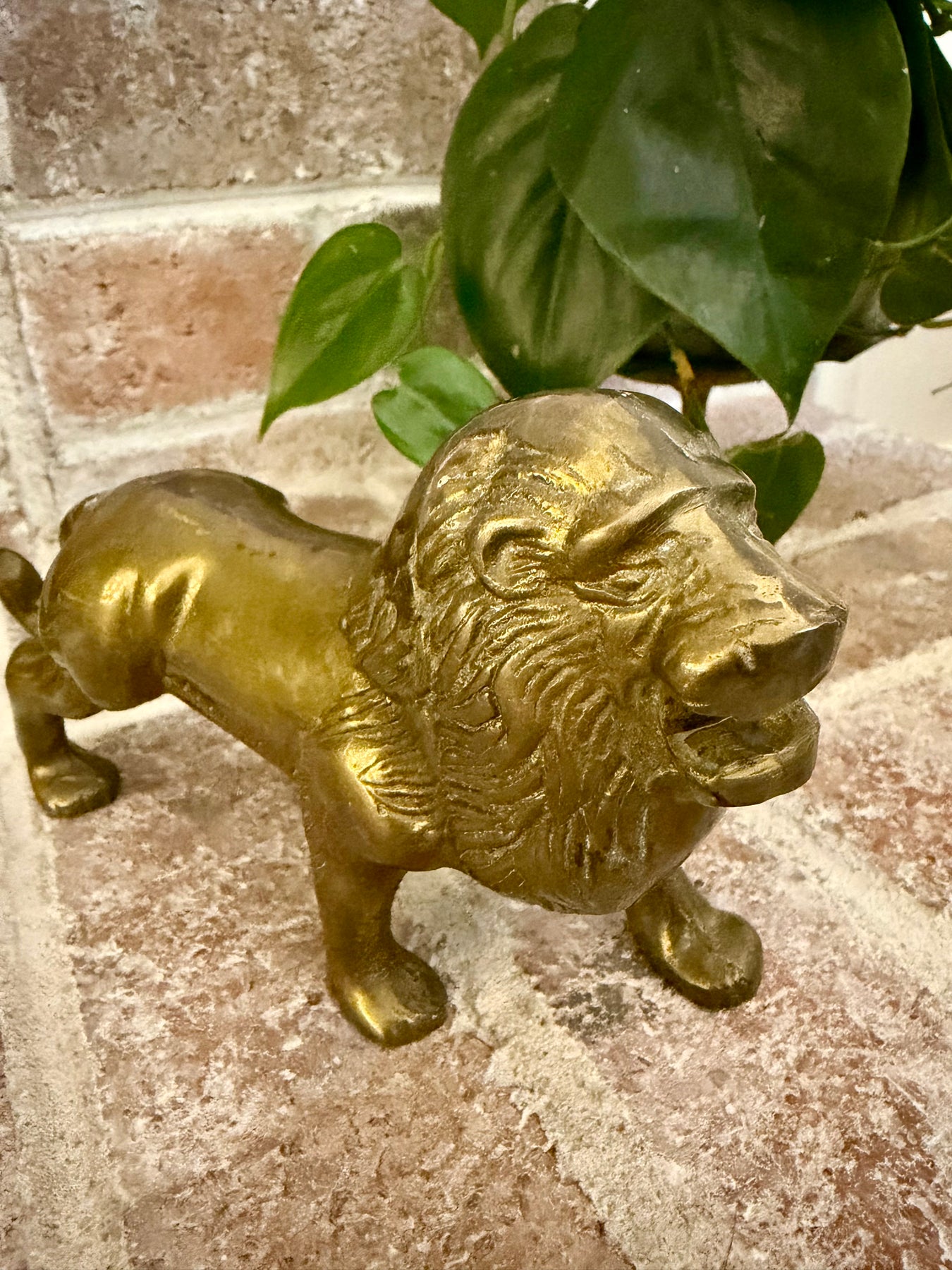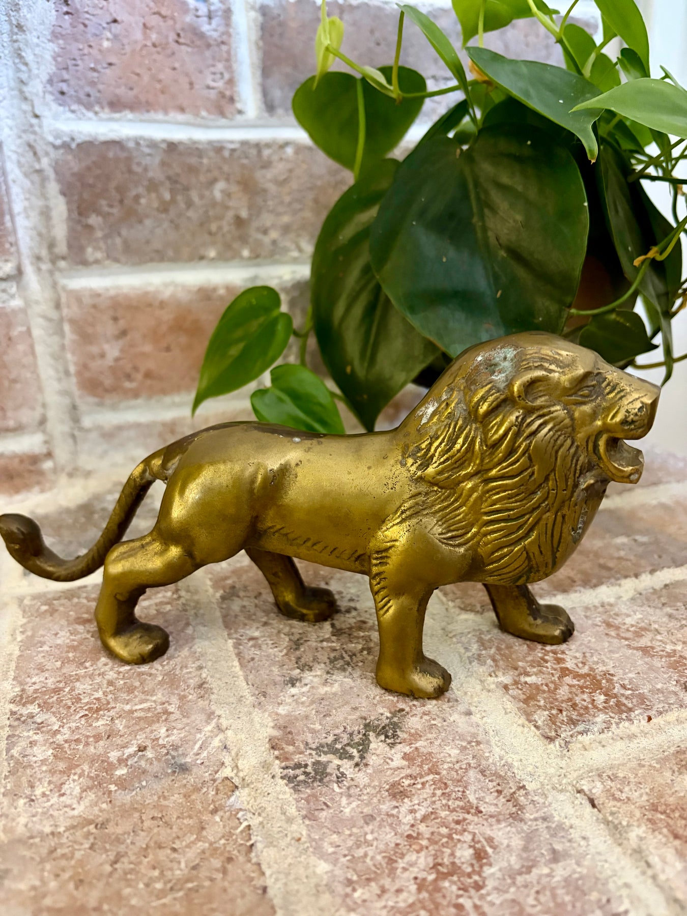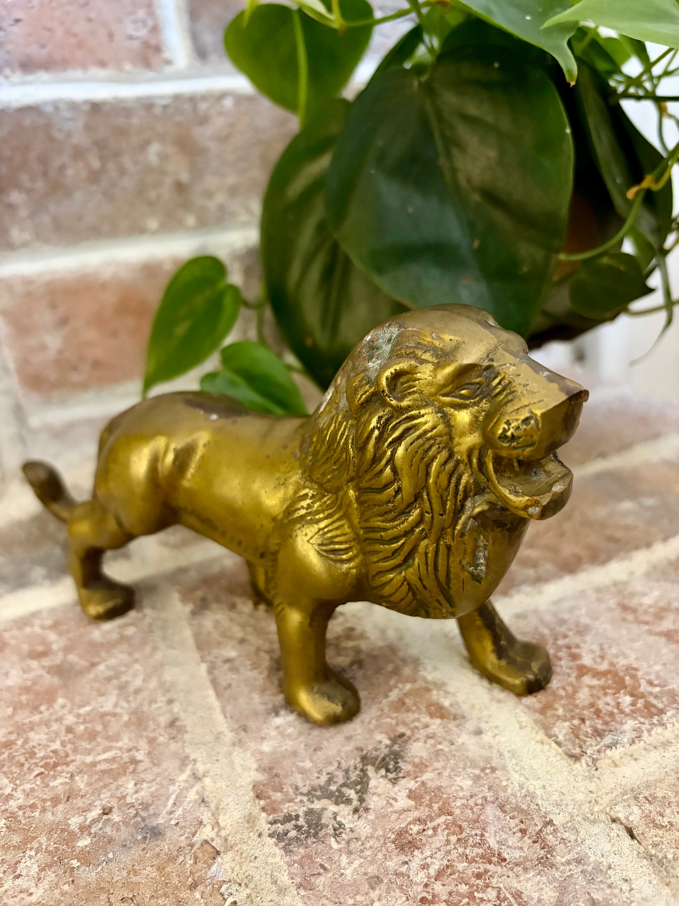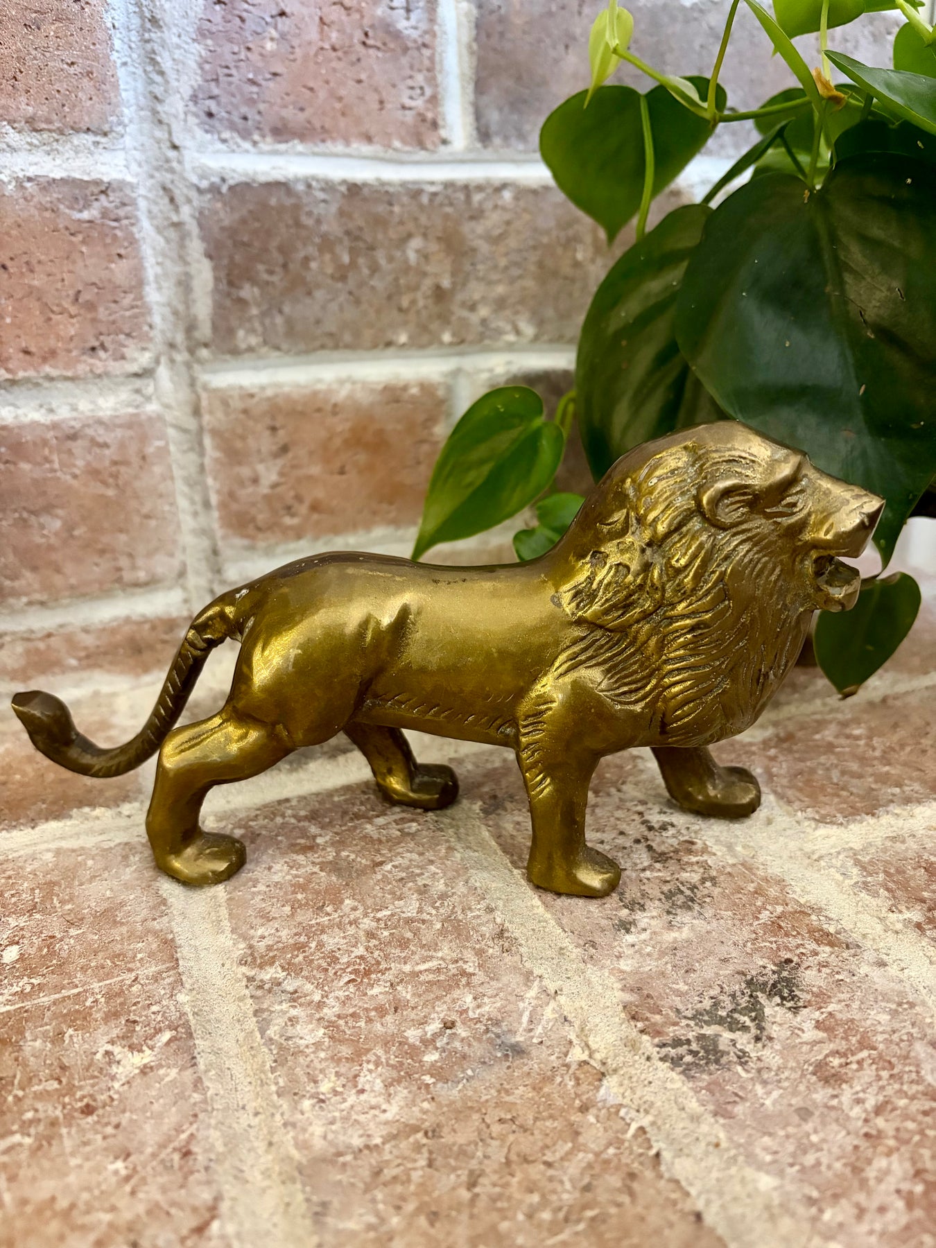 Bold and majestic! This solid brass lion measures eight inches from its flowing mane to its tail, making it a striking statement piece for any shelf or desk. With a polished finish and powerful stance, it brings a touch of strength and elegance to your décor.