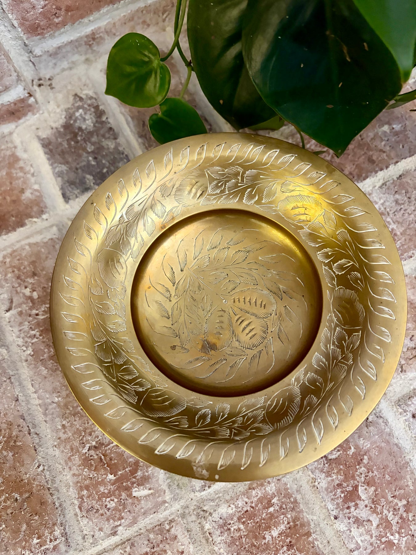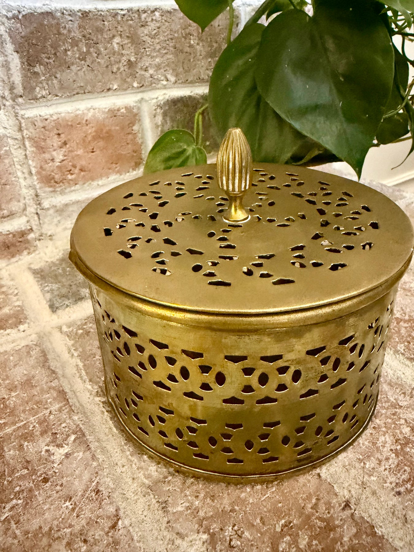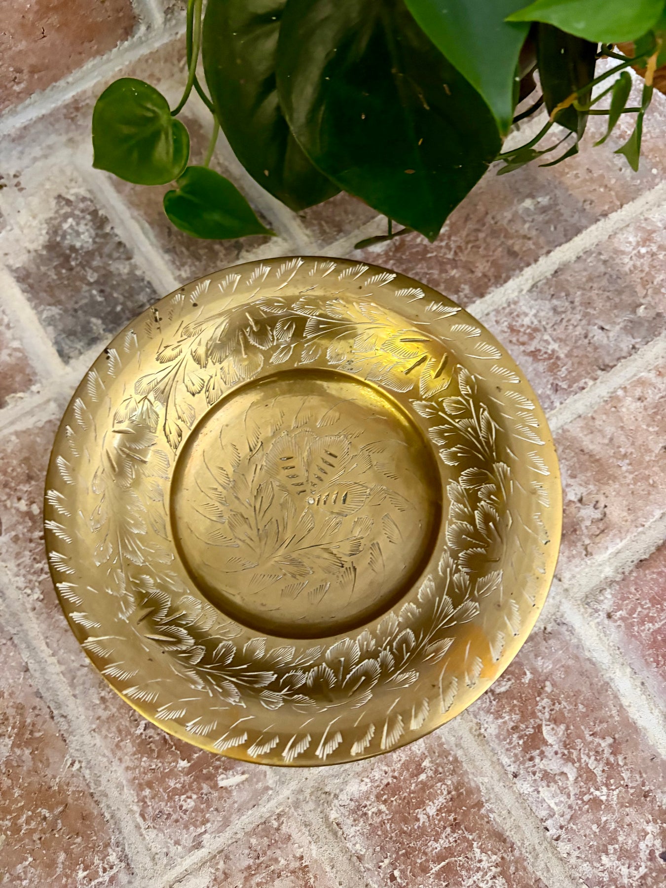 Add a warm glow with timeless elegance! This etched brass candle stand measures seven inches across and three inches high, featuring intricate detailing that catches the light beautifully. Perfect for your favorite Good Roots candle, it brings a touch of vintage charm to any table or mantel.