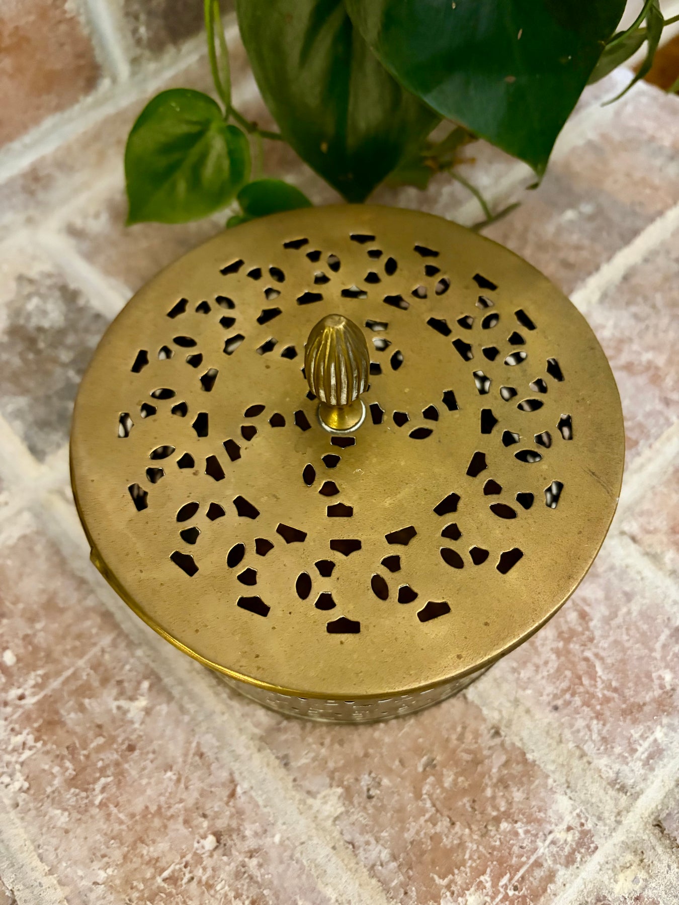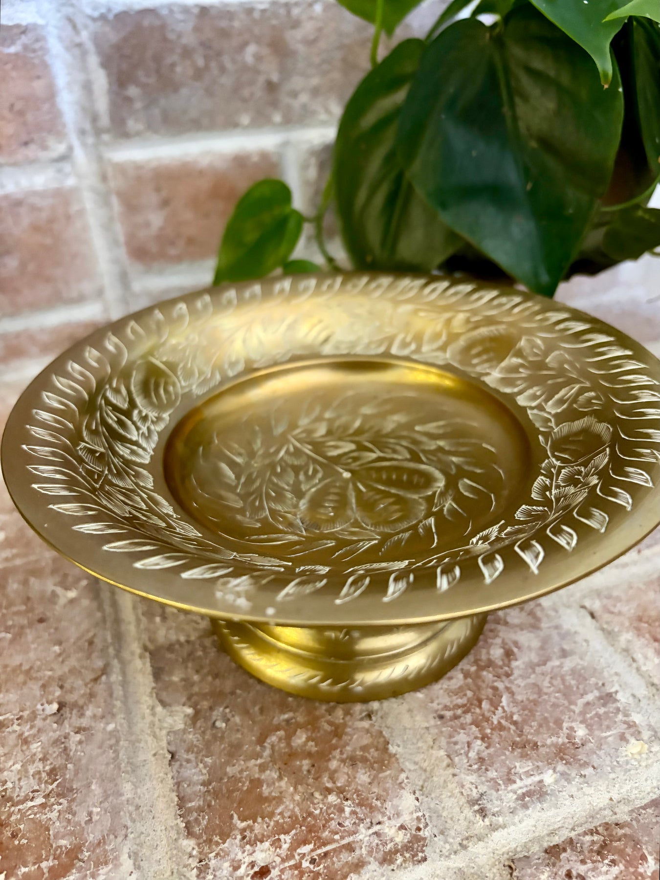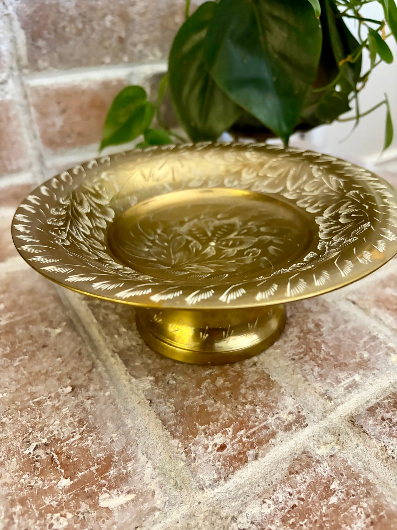 Add a warm glow with timeless elegance! This etched brass candle stand measures seven inches across and three inches high, featuring intricate detailing that catches the light beautifully. Perfect for your favorite Good Roots candle, it brings a touch of vintage charm to any table or mantel.