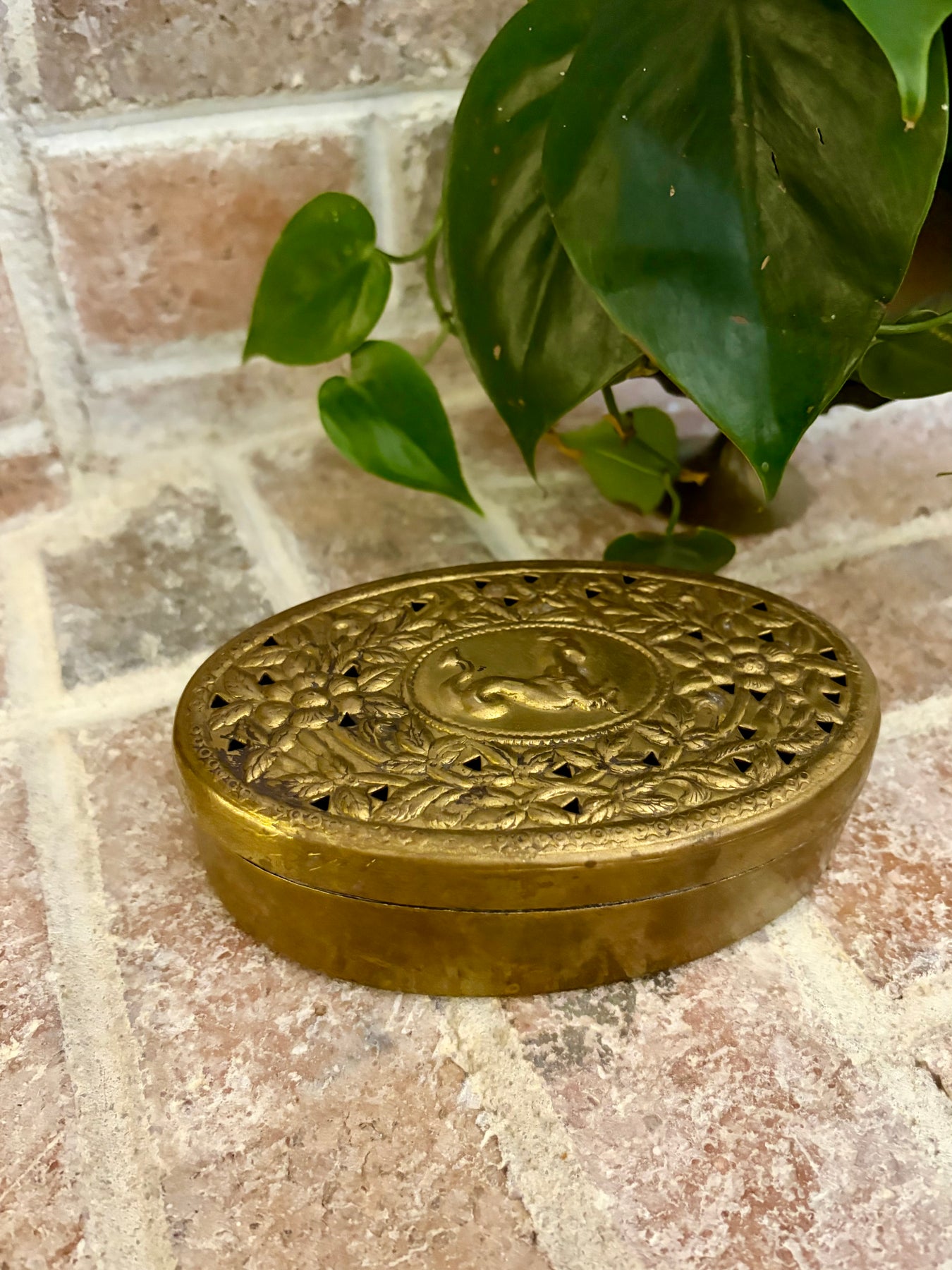 A classic beauty with a golden glow! This brass box stands three inches tall and spans five inches across, making it perfect for storing jewelry, keepsakes, or treasures. Its bohemian design adds a touch of flair to any space.