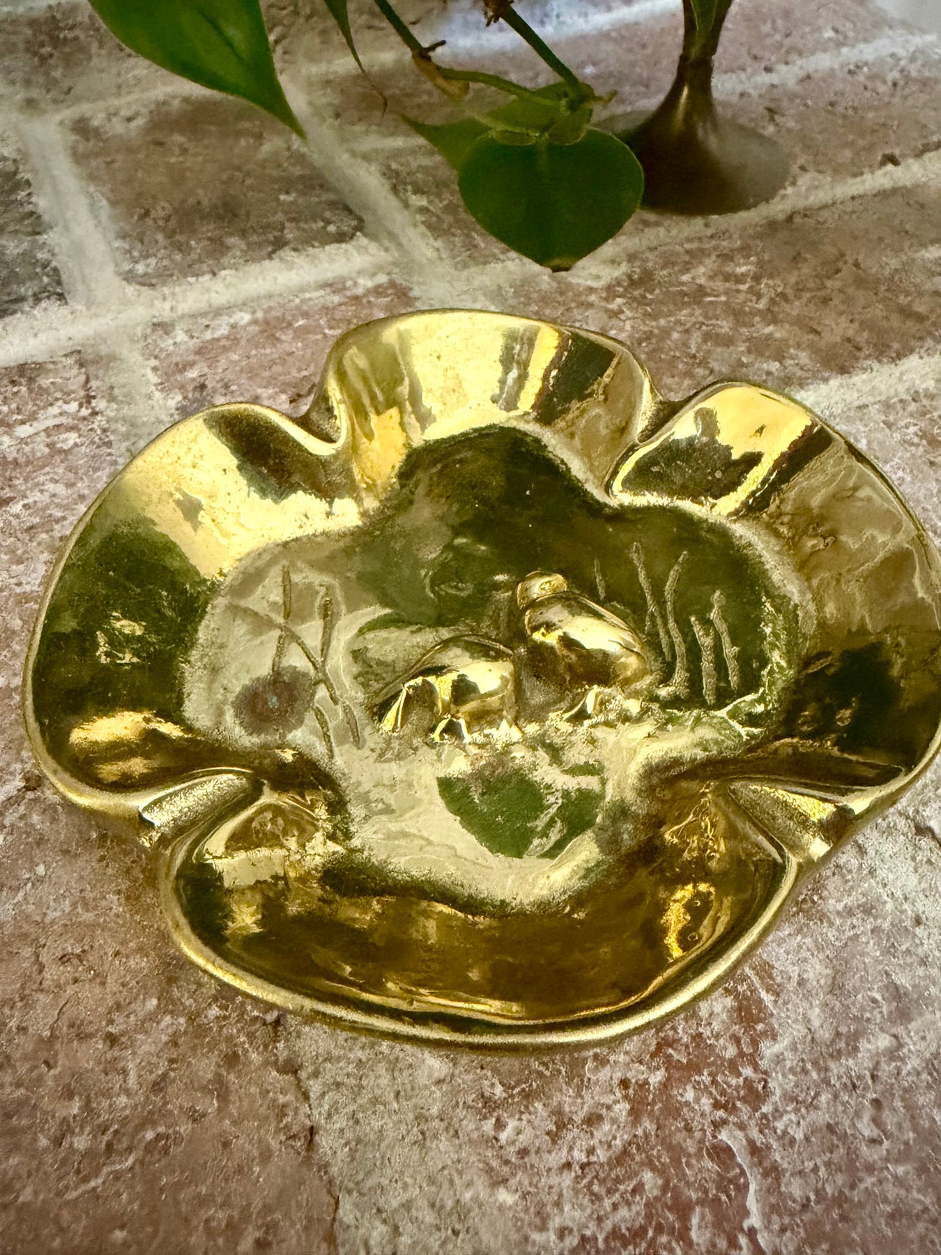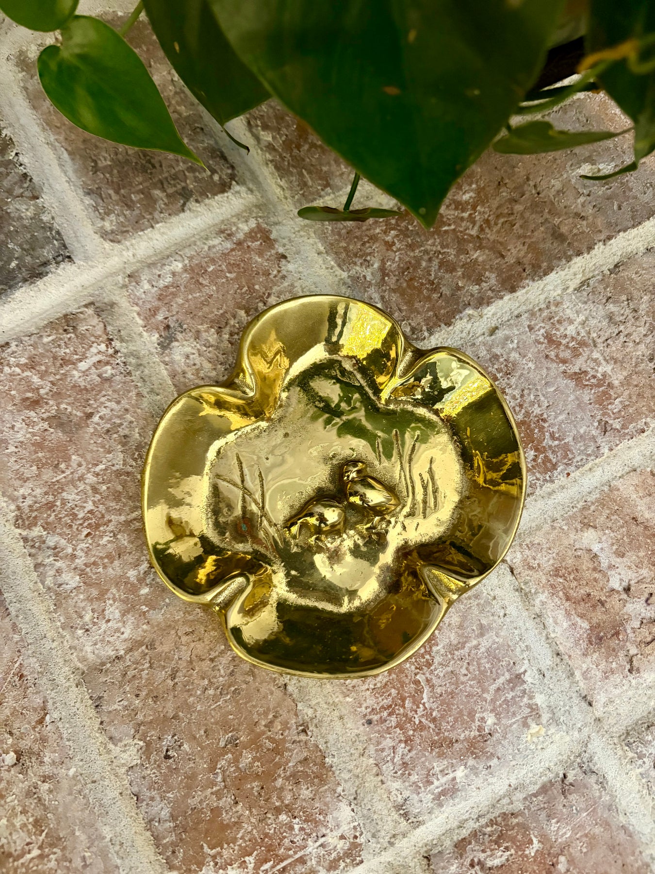 Full of charm, this brass lily pad dish measures 4.5 inches across and brings a touch of nature indoors. Crafted by Virginia Metal Crafters, it’s perfect for holding rings, keys, or tiny treasures. Its graceful design and warm metallic finish make it a lovely accent for any table or vanity.
