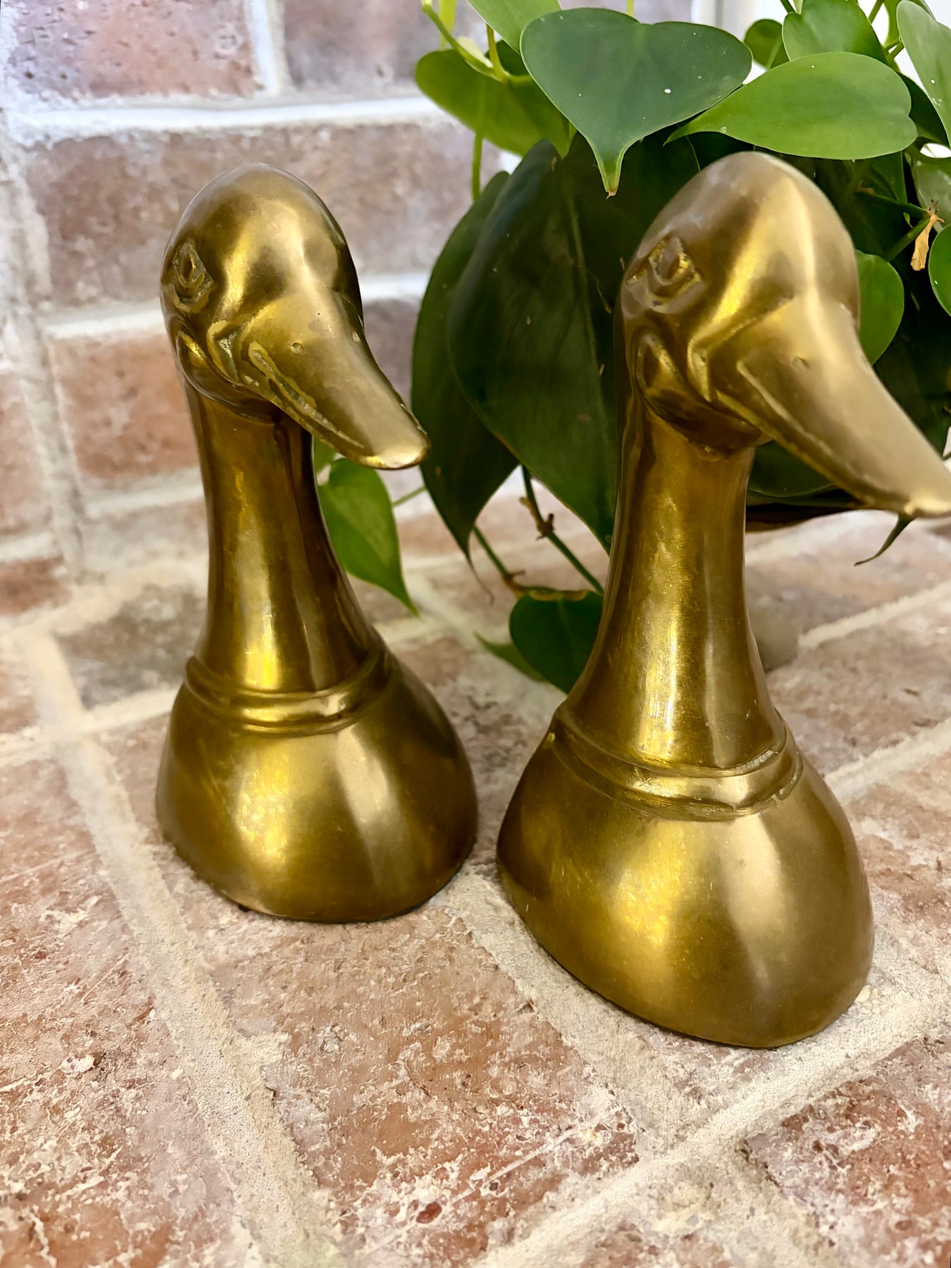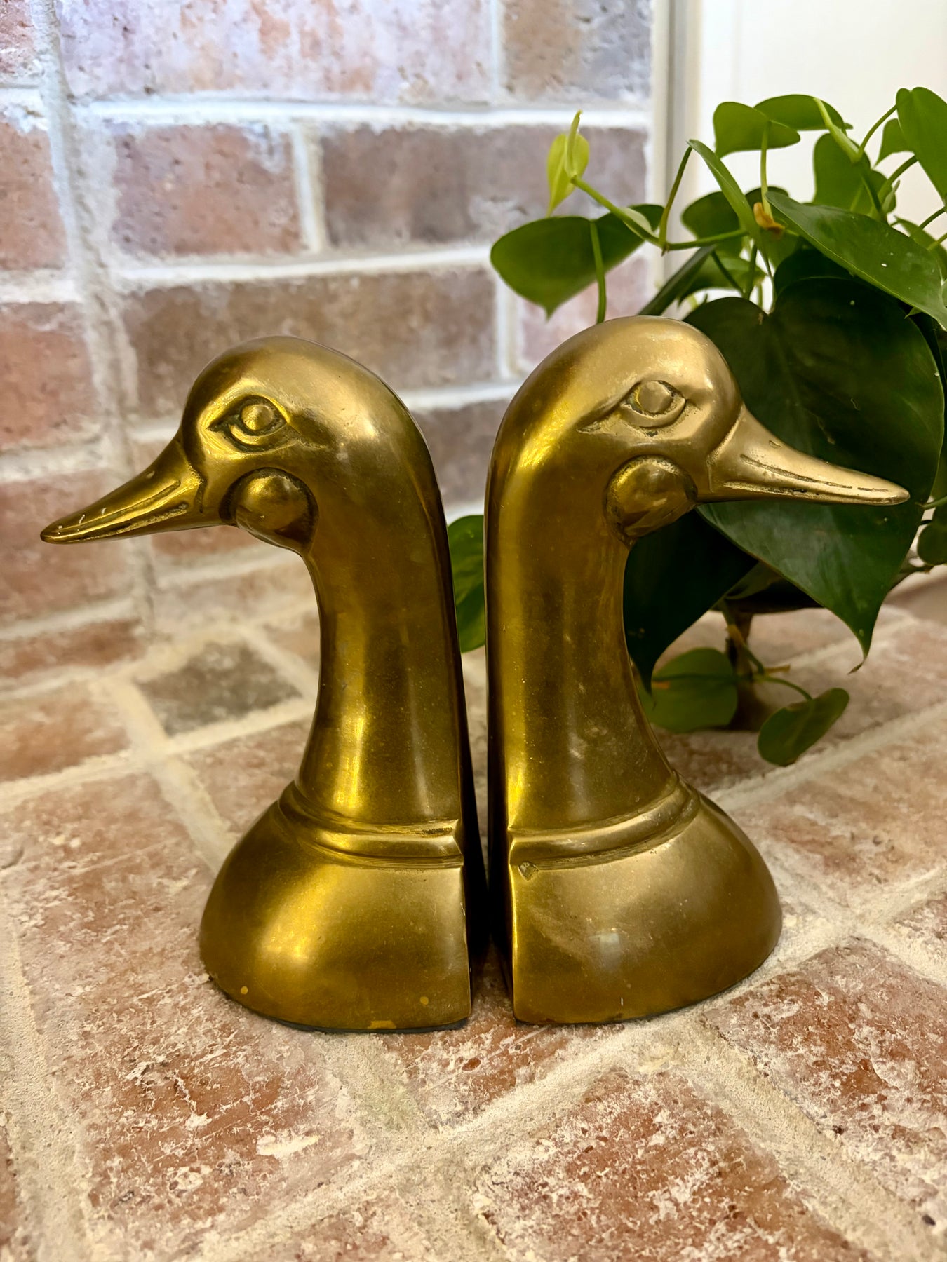 Bring a touch of elegance to your bookshelf! This pair of brass duck bookends stands six and a half inches tall, combining sturdy functionality with timeless charm. Their polished finish and graceful design make them perfect for keeping your favorite reads in place while adding a sophisticated accent to any space.