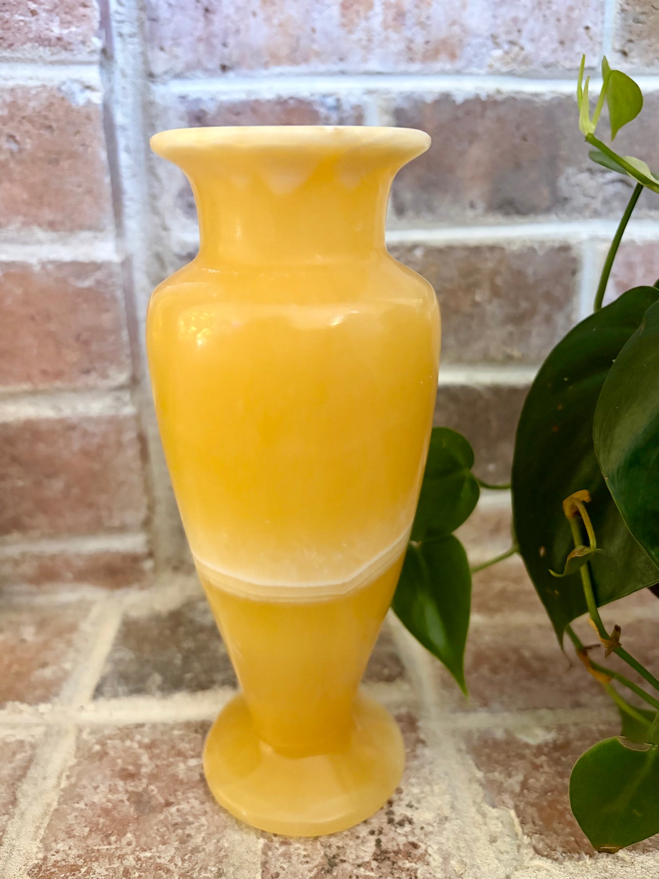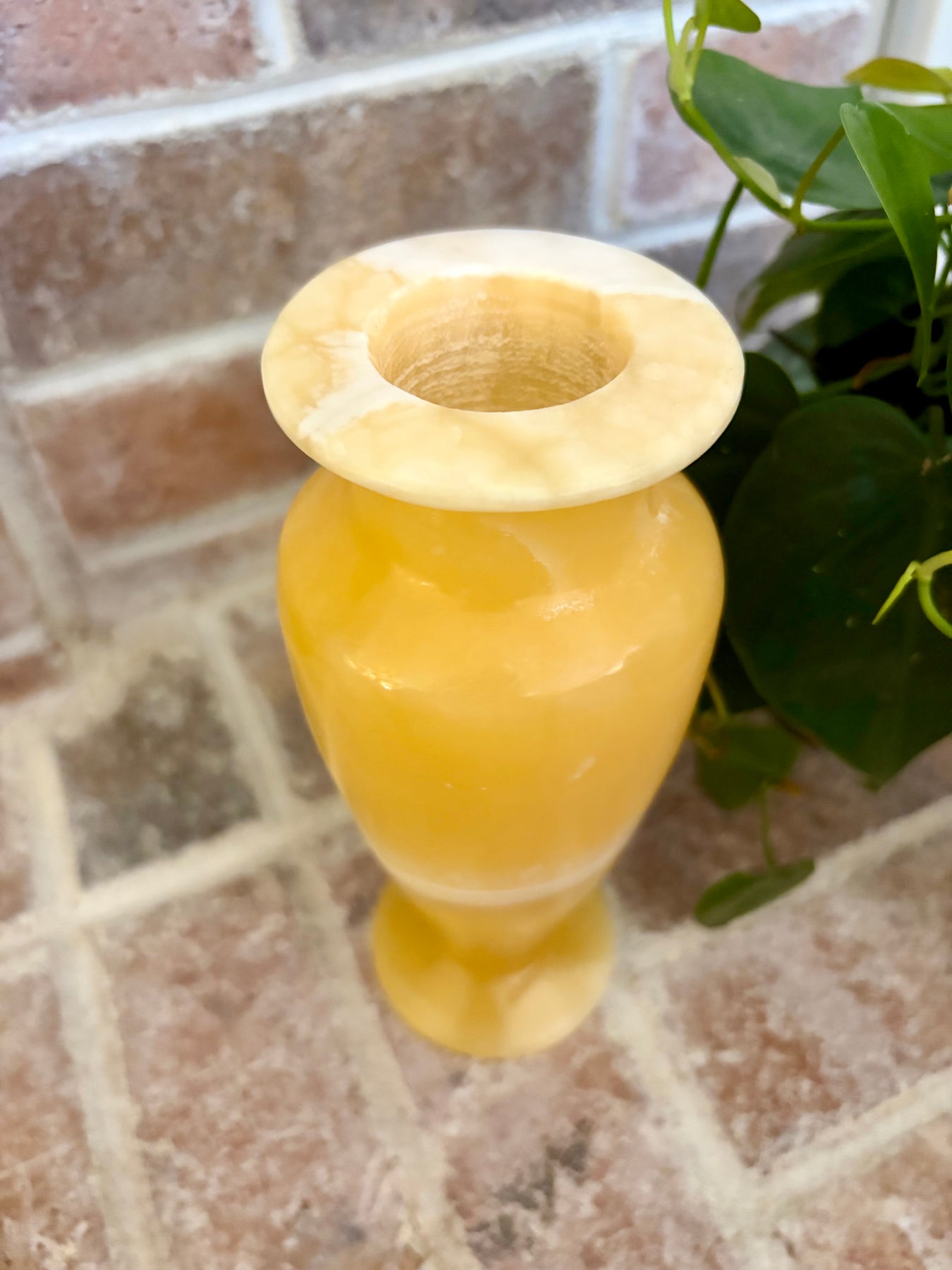 Add timeless elegance to your space with this 7.5-inch onyx vase. Crafted from natural onyx, its smooth, polished surface reveals striking veining and rich tones for a bold, sophisticated look. Perfect as a standalone accent or paired with fresh blooms, this piece brings luxurious depth to any décor.