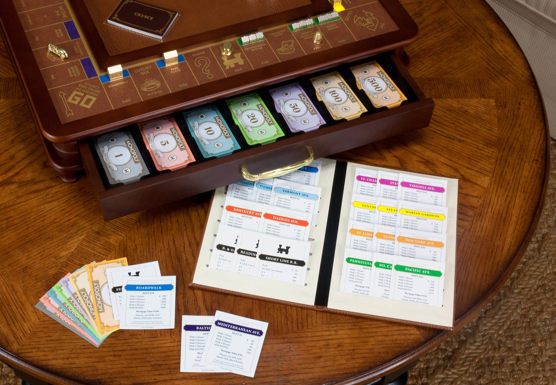 This heirloom quality MONOPOLY edition will be the envy of moguls everywhere! It features a handsome burl-finished wood cabinet with a die-cast metal plaque and die cast metal drawer pulls. The gorgeous MONOPOLY game surface features luxurious gold foil stamping and a recessed faux leather rolling area. Upon opening one drawer, you will find an elegant bank teller style money tray. Open the other and you will discover stunning MONOPOLY game components including die cast metal houses, hotels, and movers, a faux-leather wrapped title deed card holder and premium Commmunity Chest and Chance cards and MONOPOLY money and dice. Includes 8 die-cast metal tokens: Battleship, Boot, Horse and Rider, Race Car, Scottie Dog, Top Hat, Iron, Thimble Game cabinet measures 22 x 22 x 4.25 inches and weighs 14.5 pounds with all game components stored inside the storage drawers.